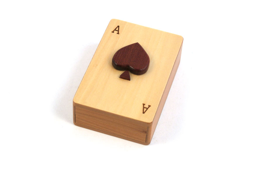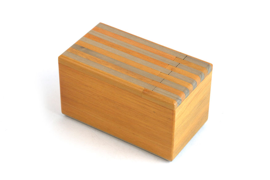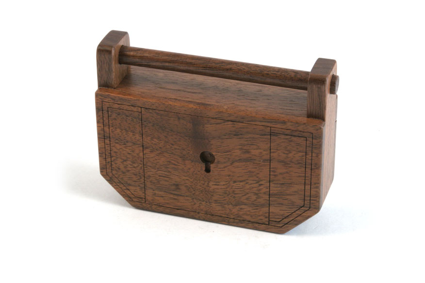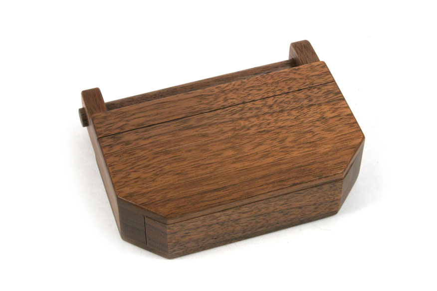 Designer/Maker: Tatsuo Miyamoto Tatsuo Miyamoto Size: 12x8x6cm Notes: Trick opening box; must take care not to force the mechanism. This was an 2008 Karakuri Club Christmas present. Includes original box and copy of solution sheet. More information: https://karakuri.gr.jp/en/products/my-13/ |