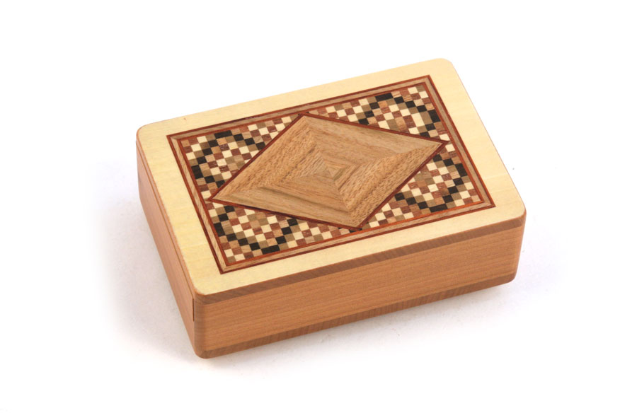 Designer/Maker: Tatsuo Miyamoto Tatsuo Miyamoto Size: 12x8x4cm Notes: Trick opening box; and first time this designer has created yosegi (with advice from Ninomiya; see reverse photo). Very small and light dent at one end. This was an 2006 Karakuri Club Christmas present. Includes original box and copy of solution sheet. More information: https://karakuri.gr.jp/en/products/my-8/ |
