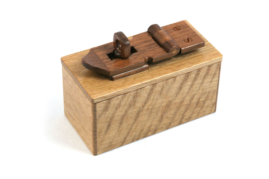 Designer/Maker: Tatsuo Miyamoto Tatsuo Miyamoto Size: 12x9x3cm Notes: Open the locked drawer. Sliding panel has slight gaps and not well hidden (see extra photo). This was an 2014 Karakuri Club Christmas present. Includes original box and copy of solution sheet. More information: https://karakuri.gr.jp/en/products/my-24/ |
