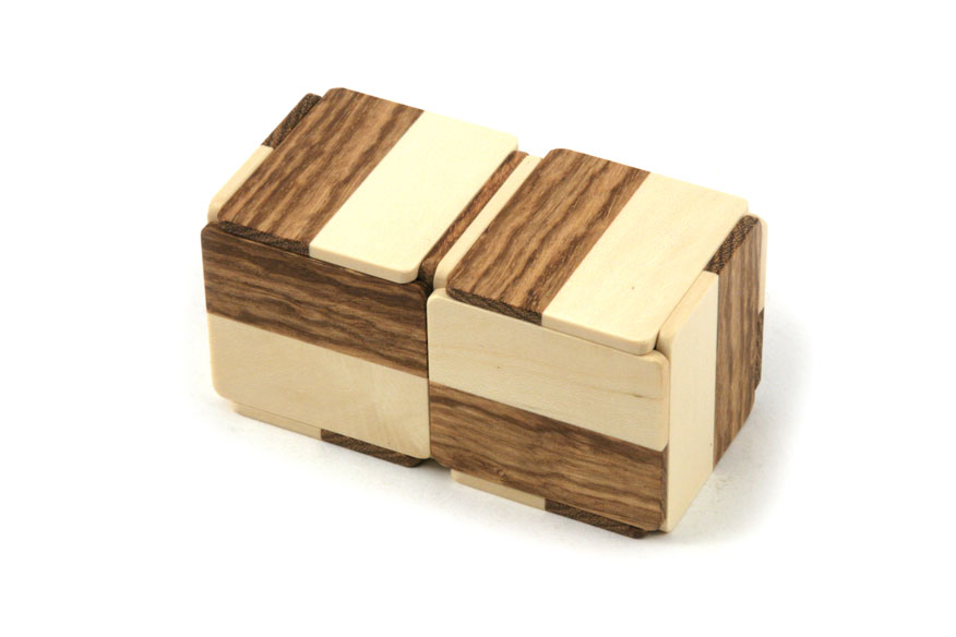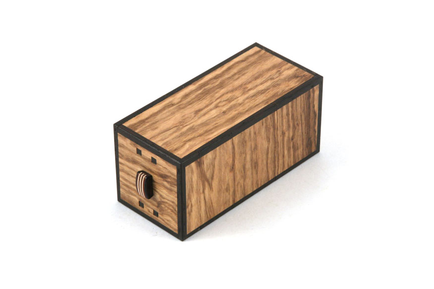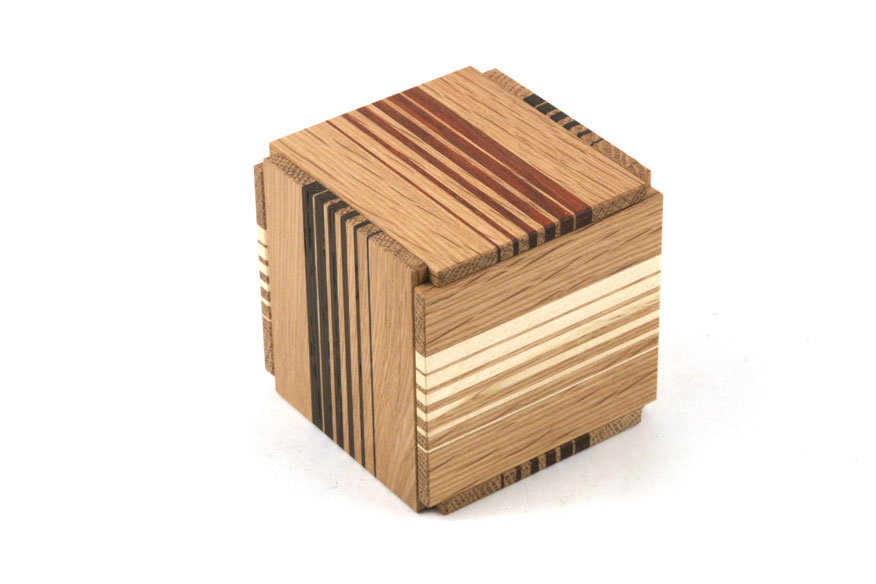 Designer/Maker: Perry McDaniel Edge: 7cm Notes: Sliding panel trick box, with 36 moves to open two secret compartments. Door panel stamped with PM logo, and one panel stamped "Christmas 2021". Includes solution sheet, and original signature box. |