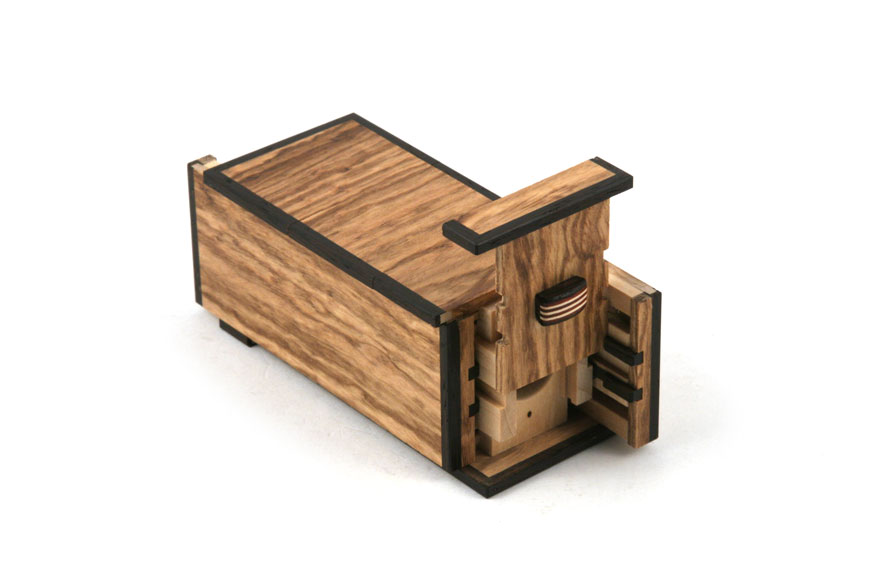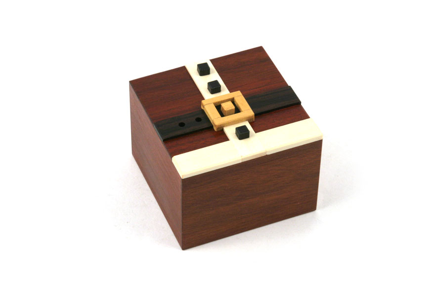 Designer/Maker: Perry McDaniel Size: 7x7x6cm Notes: 14-move to open the secret compartment. Door panel stamped with PM logo and "Christmas 2019". Includes solution sheet, and original signature box. |