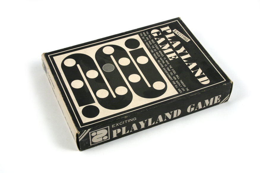 Maker: Wada Size: 26x18x4cm Notes: Guide the ball through the landscape, passing 20 numbered obstacles. Wood with plastic cover. Includes original box. Source: Dick Hess Collection |